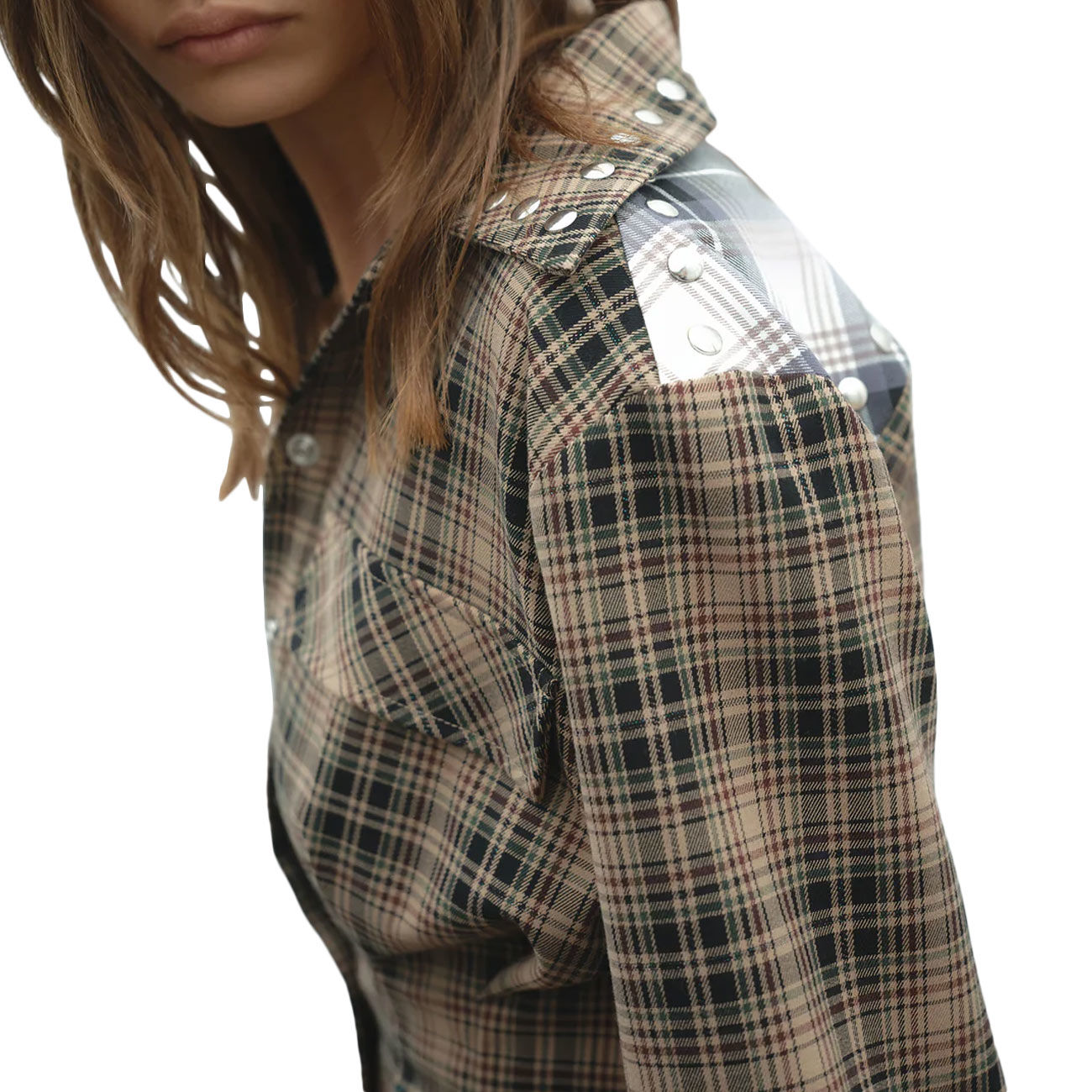 La camicia bustier unisce design strutturato e spirito rock, reinterpretando lo stile grunge con un’eleganza contemporanea. Realizzata in tessuto check, esprime personalità e carattere, trasformando un capo iconico in un must-have femminile. La costruzione sartoriale valorizza il punto vita, delineando la silhouette con raffinatezza e naturalezza. Le borchie applicate conferiscono un dettaglio glamour e deciso, aggiungendo energia e modernità al design. Perfetta da abbinare a pantaloni o gonne dallo stile urban-chic, diventa il fulcro di look sofisticati e grintosi.