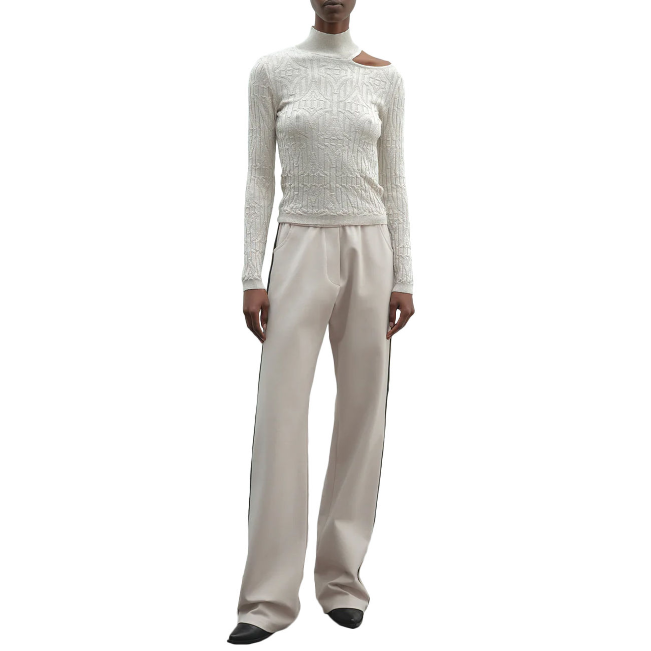 Il top in maglia a maniche lunghe di Akep interpreta la modernità con un’eleganza dal carattere deciso. Il logo all-over ne sottolinea l’identità distintiva, trasformando un capo essenziale in un’icona di stile. L’elegante collo asimmetrico, che lascia delicatamente scoperta una spalla, aggiunge un tocco sensuale e raffinato. I profili a contrasto creano un effetto grafico di forte impatto visivo, perfetto per look contemporanei e sofisticati. Il fit aderente valorizza la figura con equilibrio e femminilità.