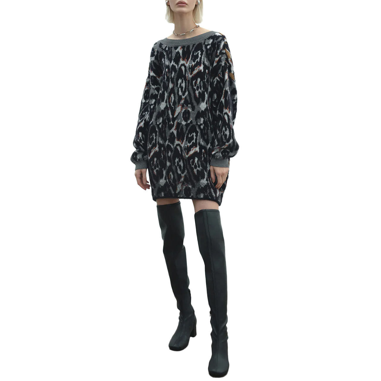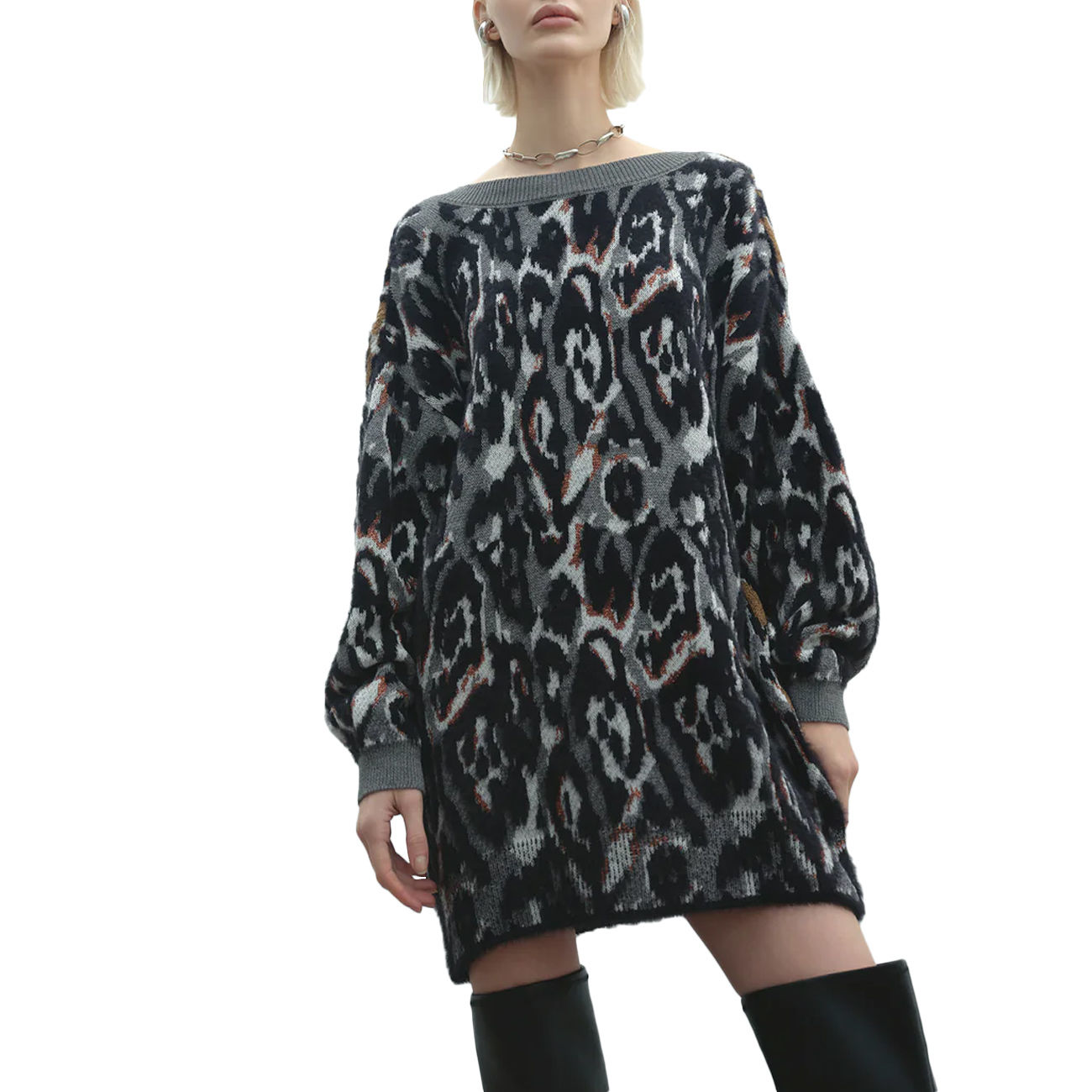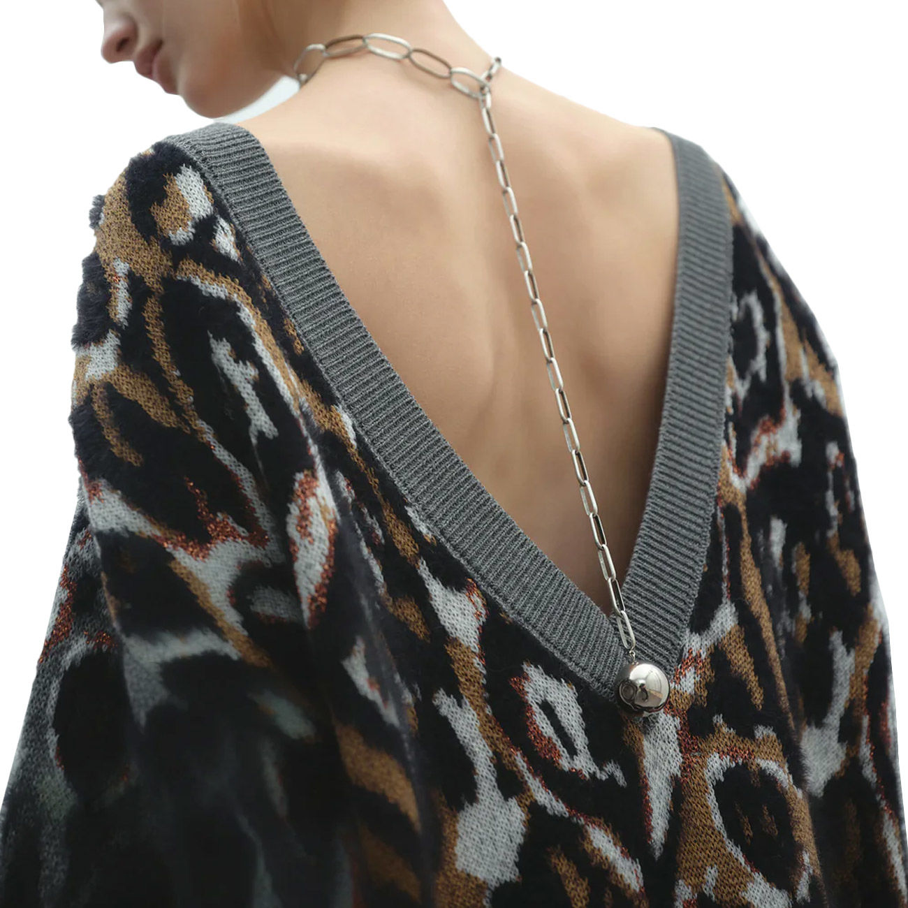Il maxipull in jacquard maculato di Akep seduce con la sua allure decisa e contemporanea. Lo scollo a “V” incornicia con eleganza la figura, mentre il motivo animalier aggiunge un tocco di energia e personalità. Morbido e confortevole, si trasforma con facilità in un abito versatile, perfetto per interpretare stili diversi con un’unica scelta di carattere. Indossato al contrario, rivela un’anima più grintosa e seducente, ideale per i look serali. Un capo che unisce audacia e raffinatezza, firmato Akep.