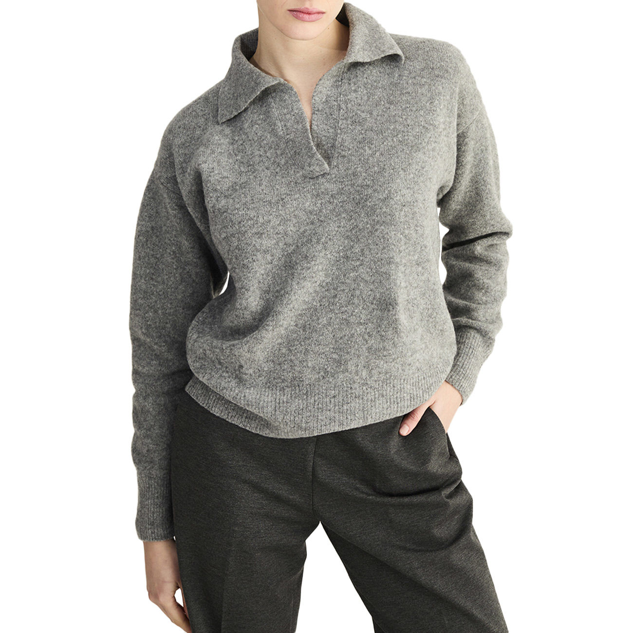 Un’ode al comfort raffinato, la polo in maglia di Anneclaire incarna l’equilibrio perfetto tra lusso e quotidianità. Realizzata in una pregiata miscela di lana e cashmere extra soft, regala una piacevole sensazione di morbidezza avvolgente. La vestibilità leggermente boxy si unisce allo scollo a V con colletto, per un tocco di eleganza d’ispirazione sporty-chic. Un capo versatile e senza tempo, pensato per accompagnare con naturalezza i momenti più esclusivi del quotidiano.