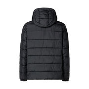 Bomber da uomo con cappuccio fisso imbottitura mista. Realizzato in tessuto idrorepellente leggero e liscio sulle maniche e corpo in nylon lucido impunturato ad onde.