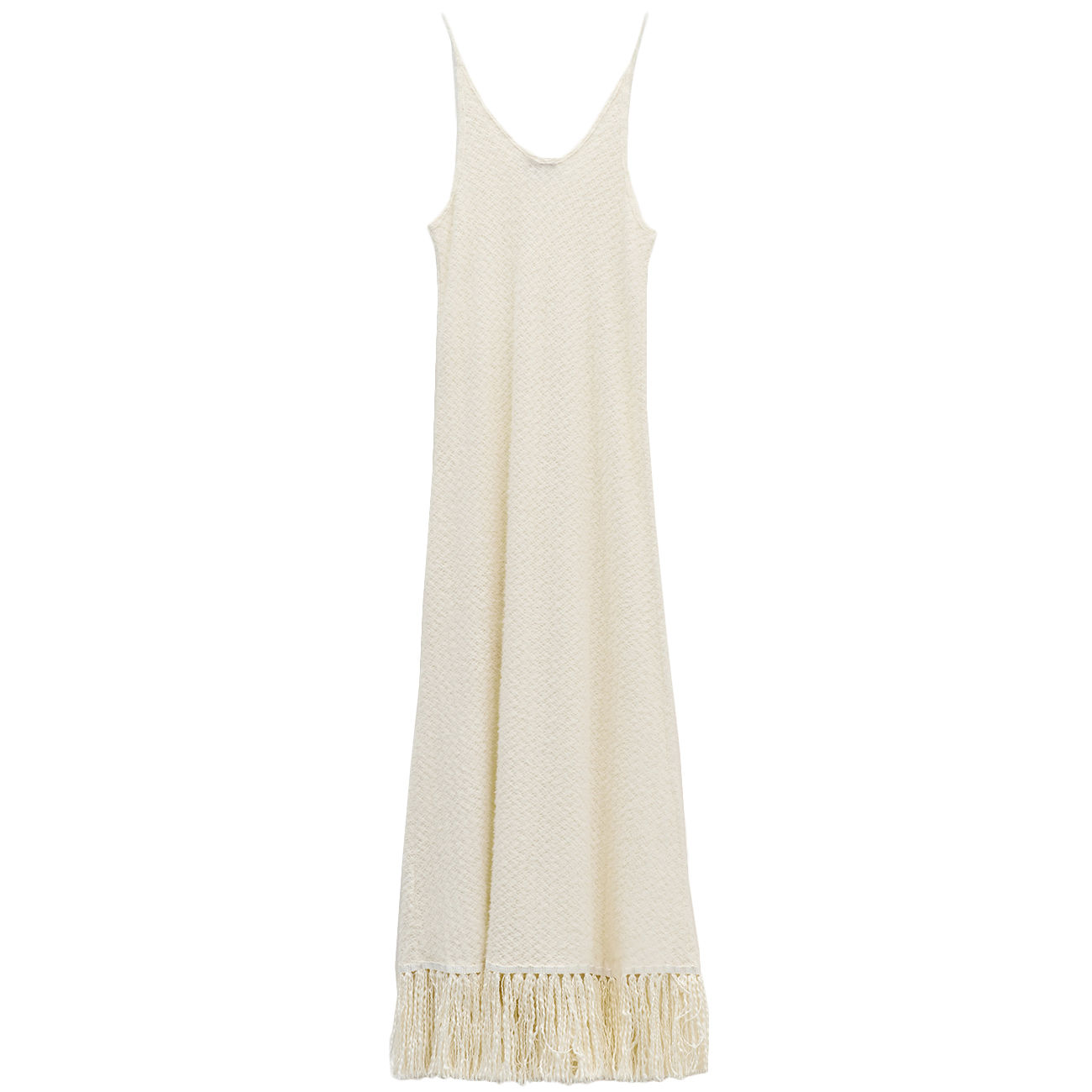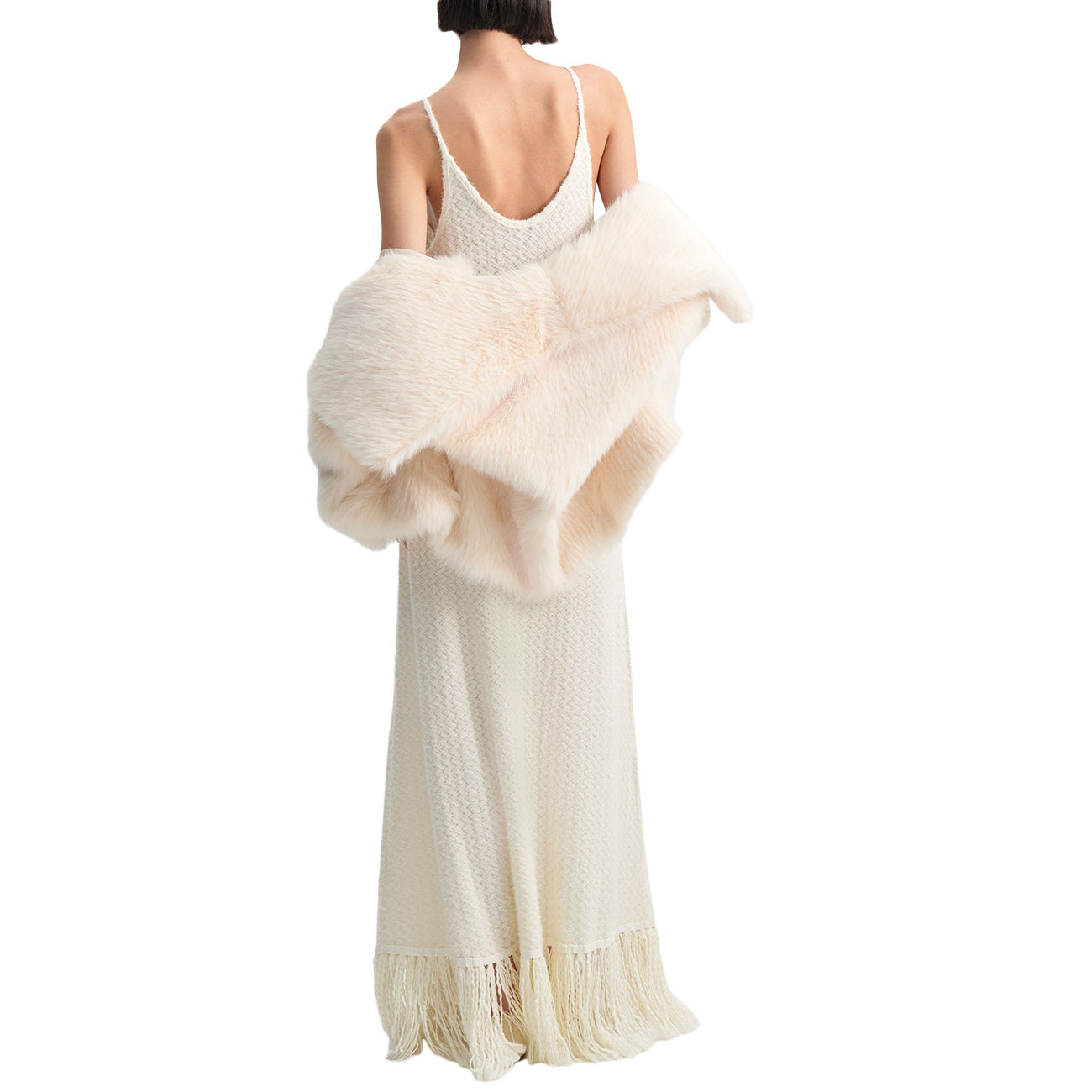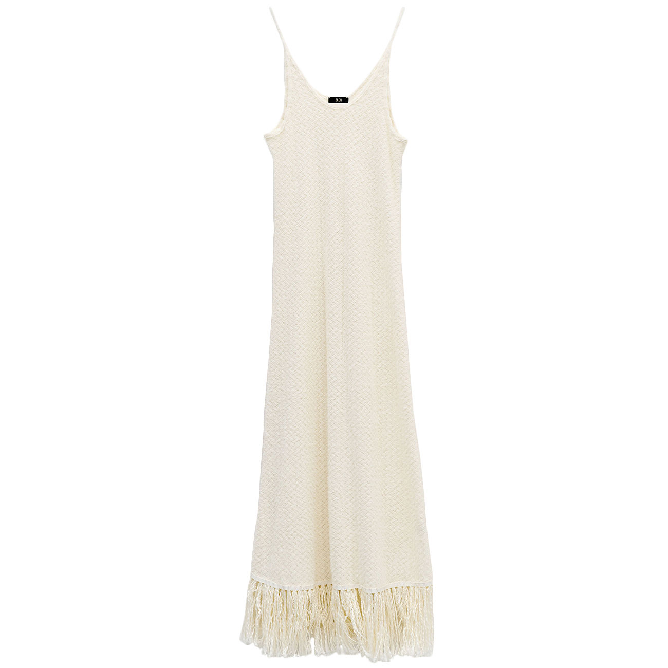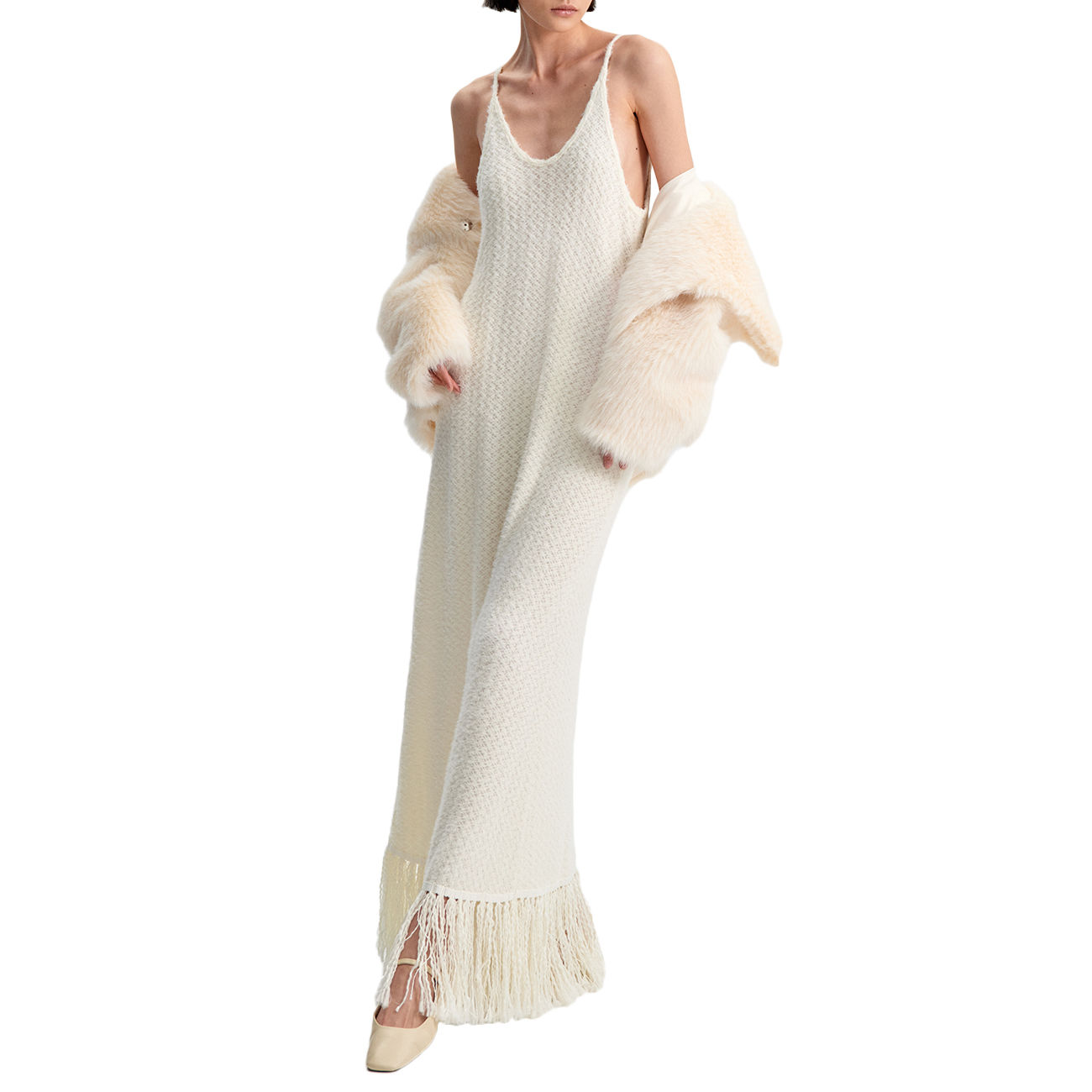 L’abito maxi in maglia di Eleh celebra un’eleganza tattile e raffinata, avvolgendo la figura in un candido panna. La texture lavorata disegna un motivo discreto e lussuoso, mentre la silhouette slip dress aderente valorizza con naturale sensualità. Spalline sottili e scollo a V donano leggerezza, bilanciata dal dettaglio bohémien delle frange che animano l’orlo con movimento fluido. Pensato per fondere comfort e stile sofisticato, è un capo capace di elevare ogni look.