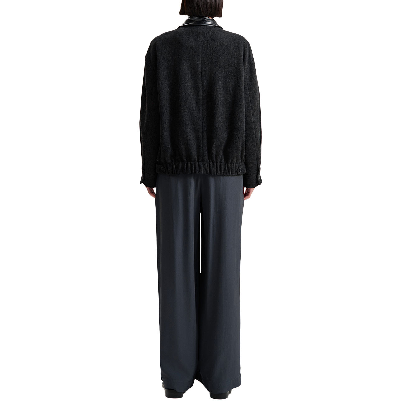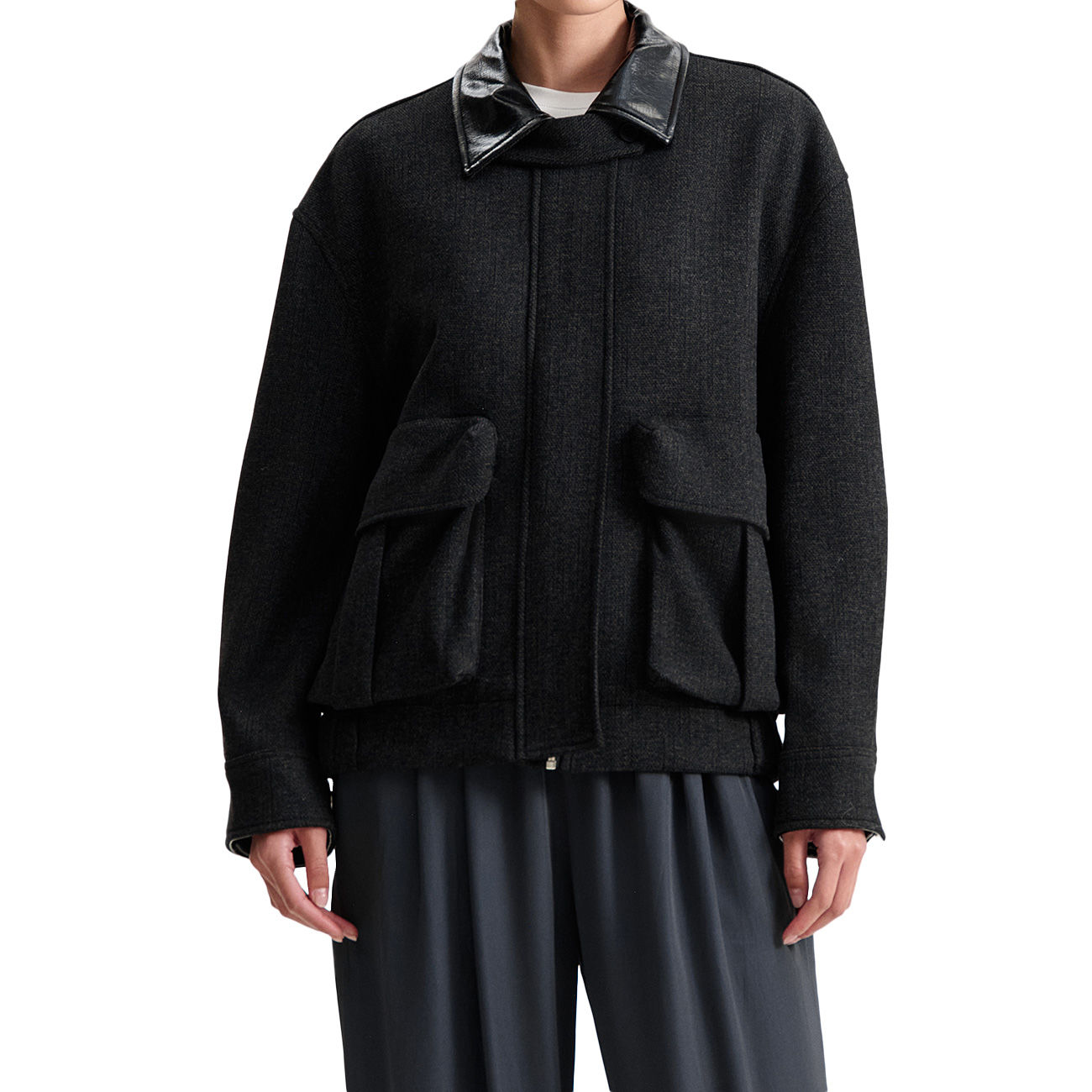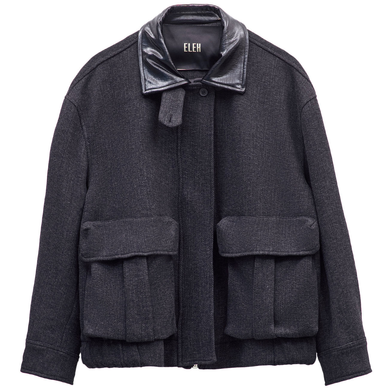 Il Bomber Eleh ridefinisce il classico capospalla con un'interpretazione di lusso e design sofisticato. Realizzato in un tessuto texturizzato nero, presenta un elegante colletto a contrasto in similpelle lucida, che aggiunge un inatteso tocco di grinta. La silhouette oversize e le tasche a soffietto offrono funzionalità e un'estetica d'impatto. Questo bomber incarna la perfetta unione tra streetwear di alta gamma e l'eleganza contemporanea che contraddistingue Eleh.