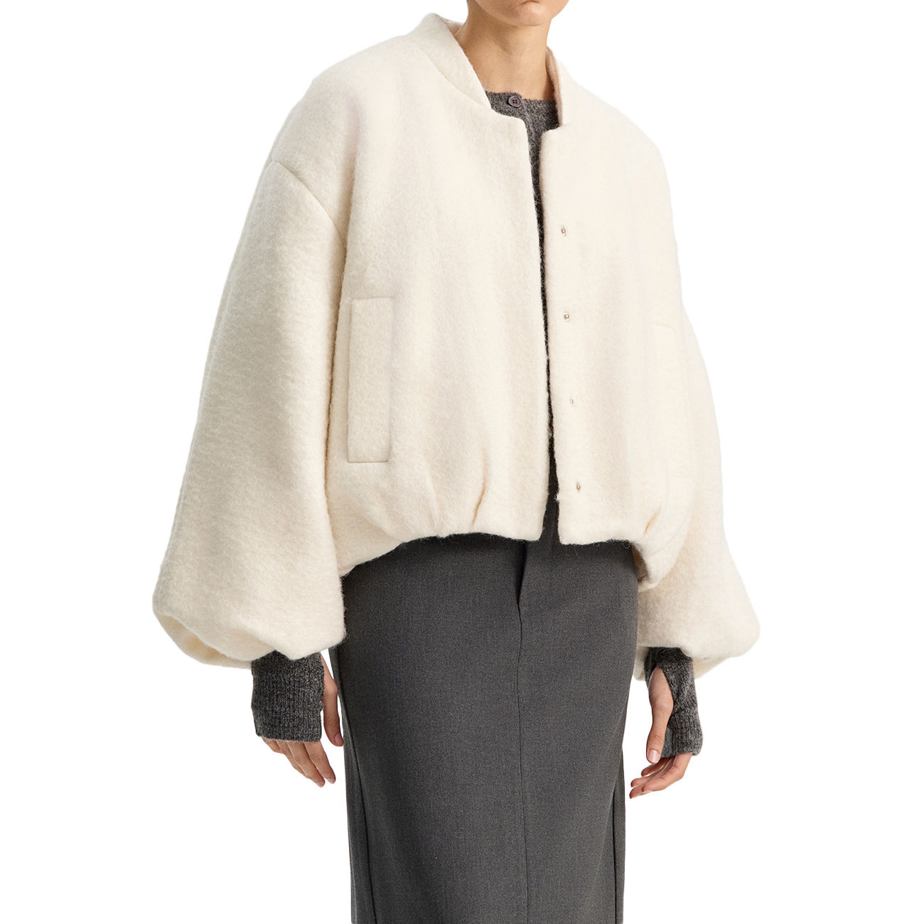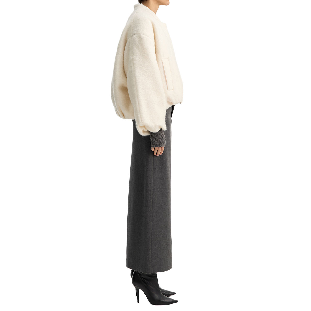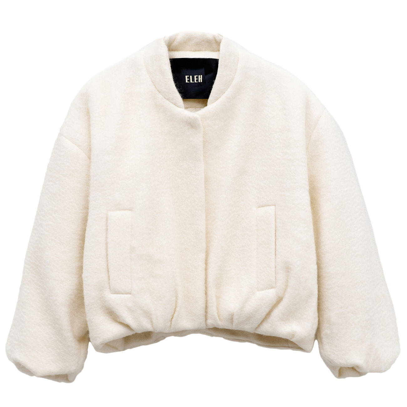 Il bomber in lana di Eleh reinventa il classico dello streetwear. La lana bouclé morbidissima in raffinata tonalità avorio dona luminosità e una texture avvolgente, mentre la silhouette oversize leggermente bombata è valorizzata dall’elastico sul fondo. L’assenza di collo e la chiusura minimalista conferiscono al capo un’eleganza pulita e contemporanea. Ogni dettaglio esprime lusso discreto e sofisticato, trasformando il bomber in un vero statement. Perfetto per arricchire il guardaroba femminile con stile moderno e raffinato.