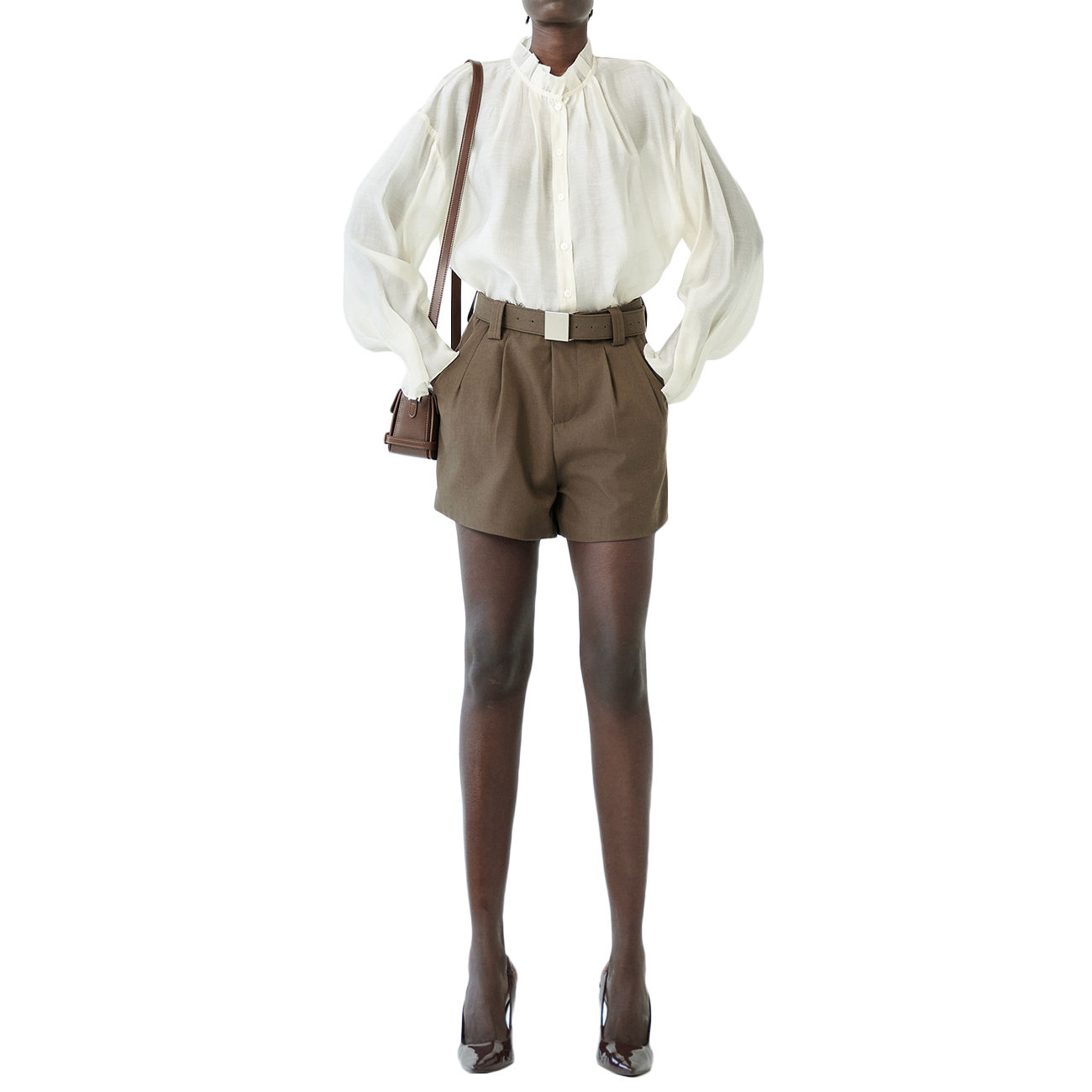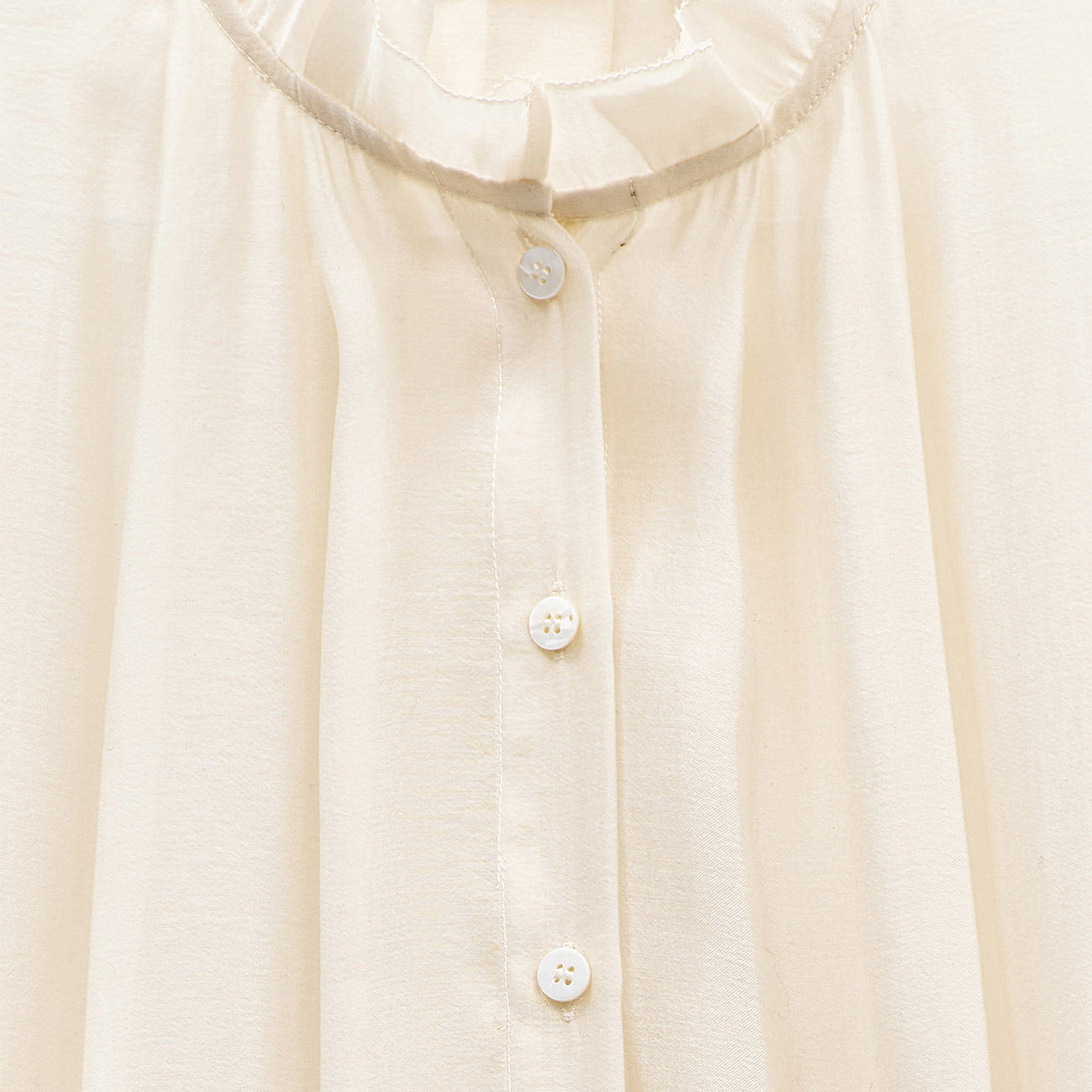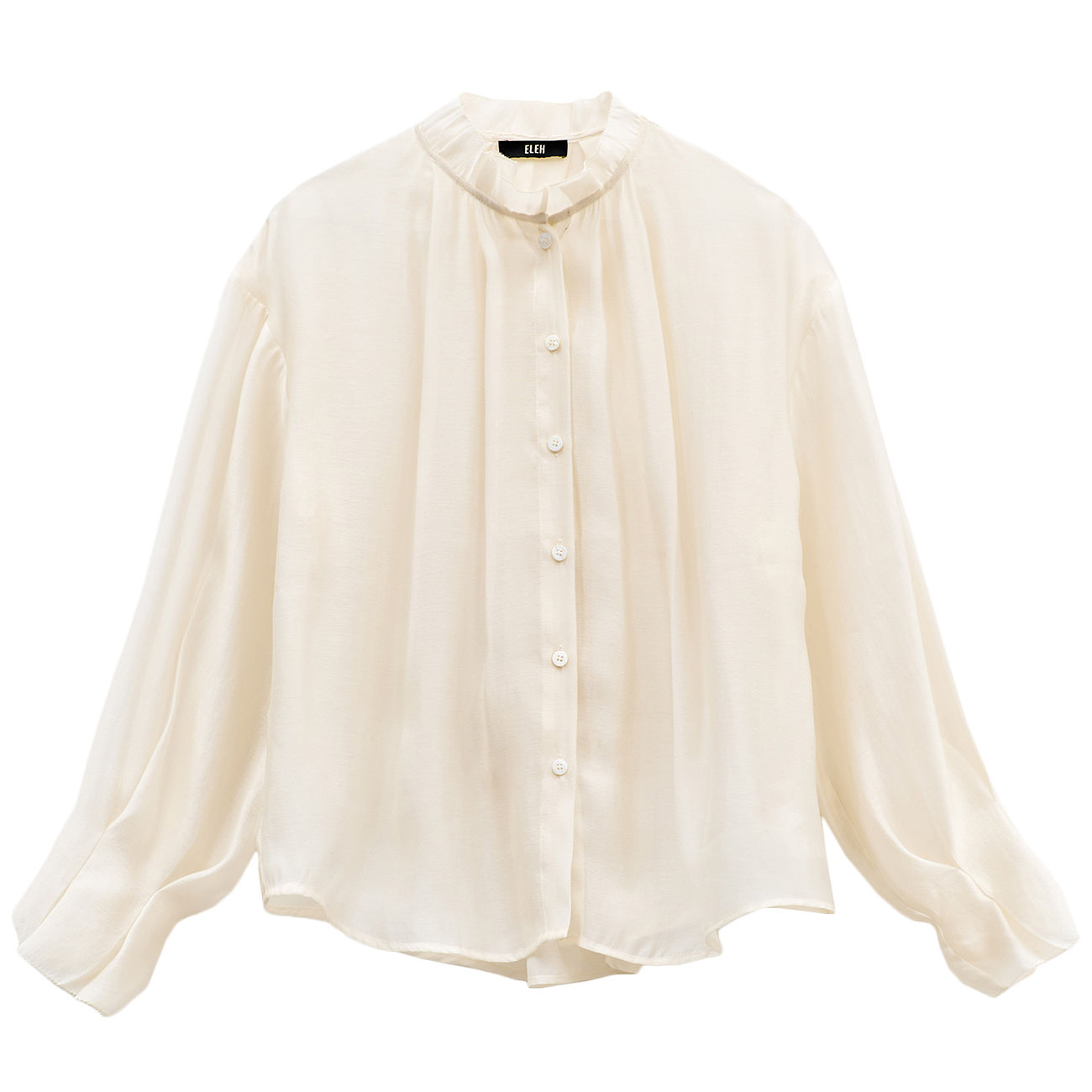 La camicia Eleh in delicato bianco esprime un’eleganza eterea e minimale, incarnando il lusso discreto. Il tessuto leggero e semitrasparente crea drappeggi fluidi e un effetto aereo, mentre il collo alto con ruches e l’abbottonatura nascosta aggiungono un raffinato tocco romantico. Le maniche a sbuffo con polsini arricciati donano volume e grazia alla silhouette. Ogni dettaglio celebra la purezza del taglio unita a un’estetica sofisticata. Un capo ideale per look femminili che combinano leggerezza, sensualità e raffinatezza contemporanea.