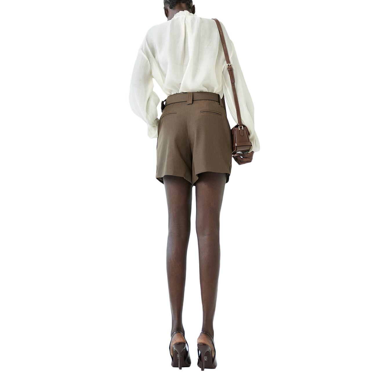 La camicia Eleh in delicato bianco esprime un’eleganza eterea e minimale, incarnando il lusso discreto. Il tessuto leggero e semitrasparente crea drappeggi fluidi e un effetto aereo, mentre il collo alto con ruches e l’abbottonatura nascosta aggiungono un raffinato tocco romantico. Le maniche a sbuffo con polsini arricciati donano volume e grazia alla silhouette. Ogni dettaglio celebra la purezza del taglio unita a un’estetica sofisticata. Un capo ideale per look femminili che combinano leggerezza, sensualità e raffinatezza contemporanea.