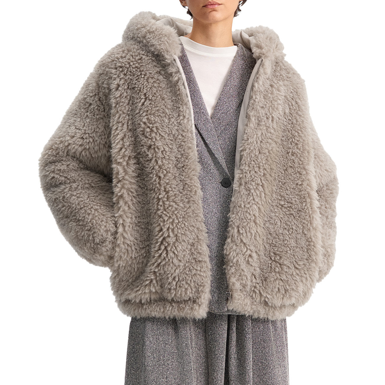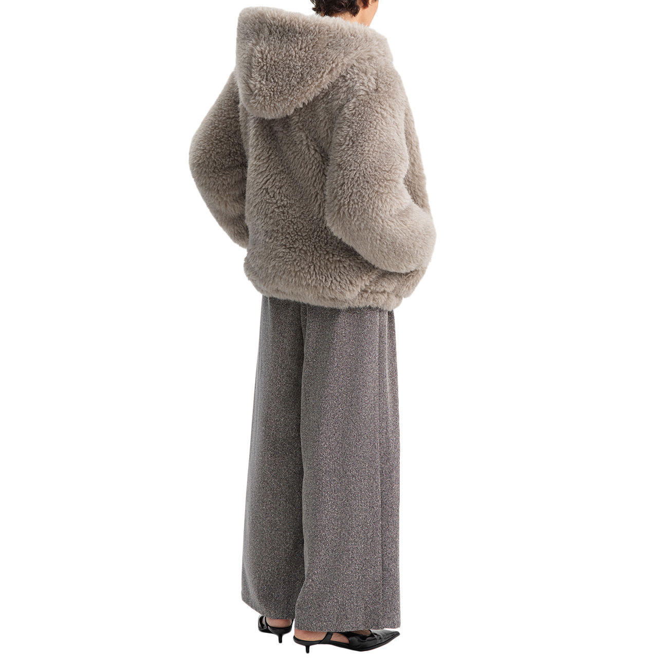 Il cappotto Orsetto incarna il cozy-chic in chiave contemporanea. La texture teddy in raffinata tonalità grigio conferisce volume, morbidezza e un calore sofisticato. Il taglio oversize e il cappuccio generoso modellano la silhouette con naturale disinvoltura. Ogni dettaglio esalta la combinazione di comfort e stile distintivo, trasformando il capo in un vero statement. Perfetto per chi desidera un lusso informale, moderno e di tendenza senza rinunciare alla raffinatezza.