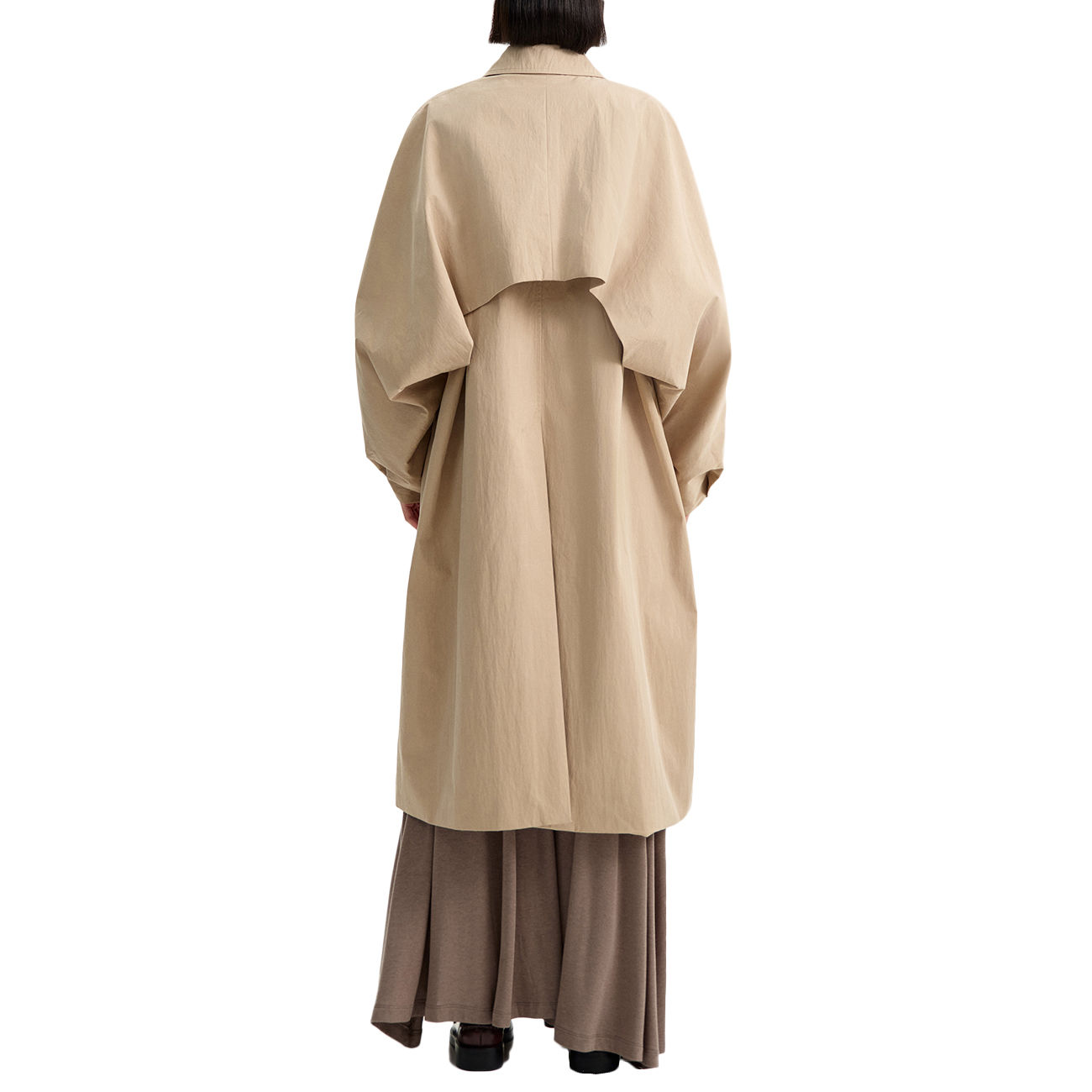 Il trench di Eleh in raffinata tonalità beige cammello reinterpreta l’icona classica con volumi moderni e fluidi. Le ampie maniche a kimono e il taglio oversize cadono a cascata con naturale eleganza, mentre l’audace mantellina posteriore e il collo con revers conferiscono un tocco sartoriale distintivo. Il tessuto leggero e impeccabile esalta la qualità del capo, garantendo comfort e movimento. Ogni dettaglio celebra un lusso discreto e sofisticato, perfetto per il layering contemporaneo. Un capospalla pensato per la donna che desidera una silhouette di grande impatto e raffinata eleganza.