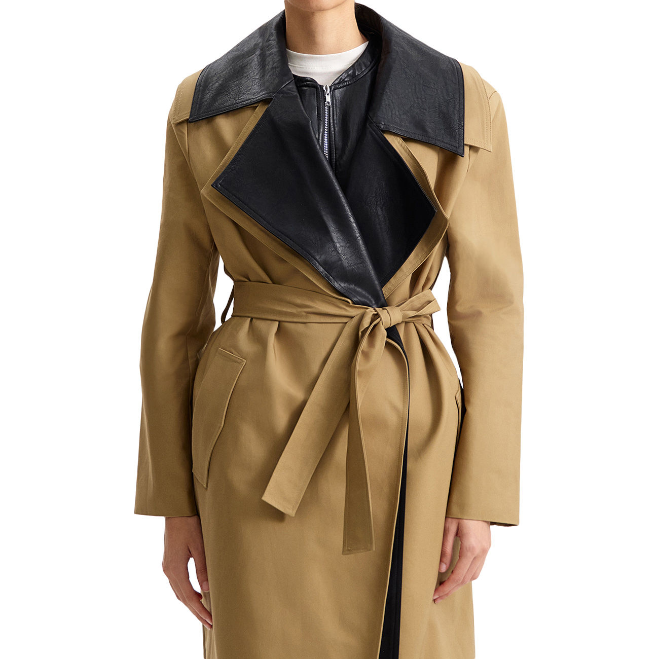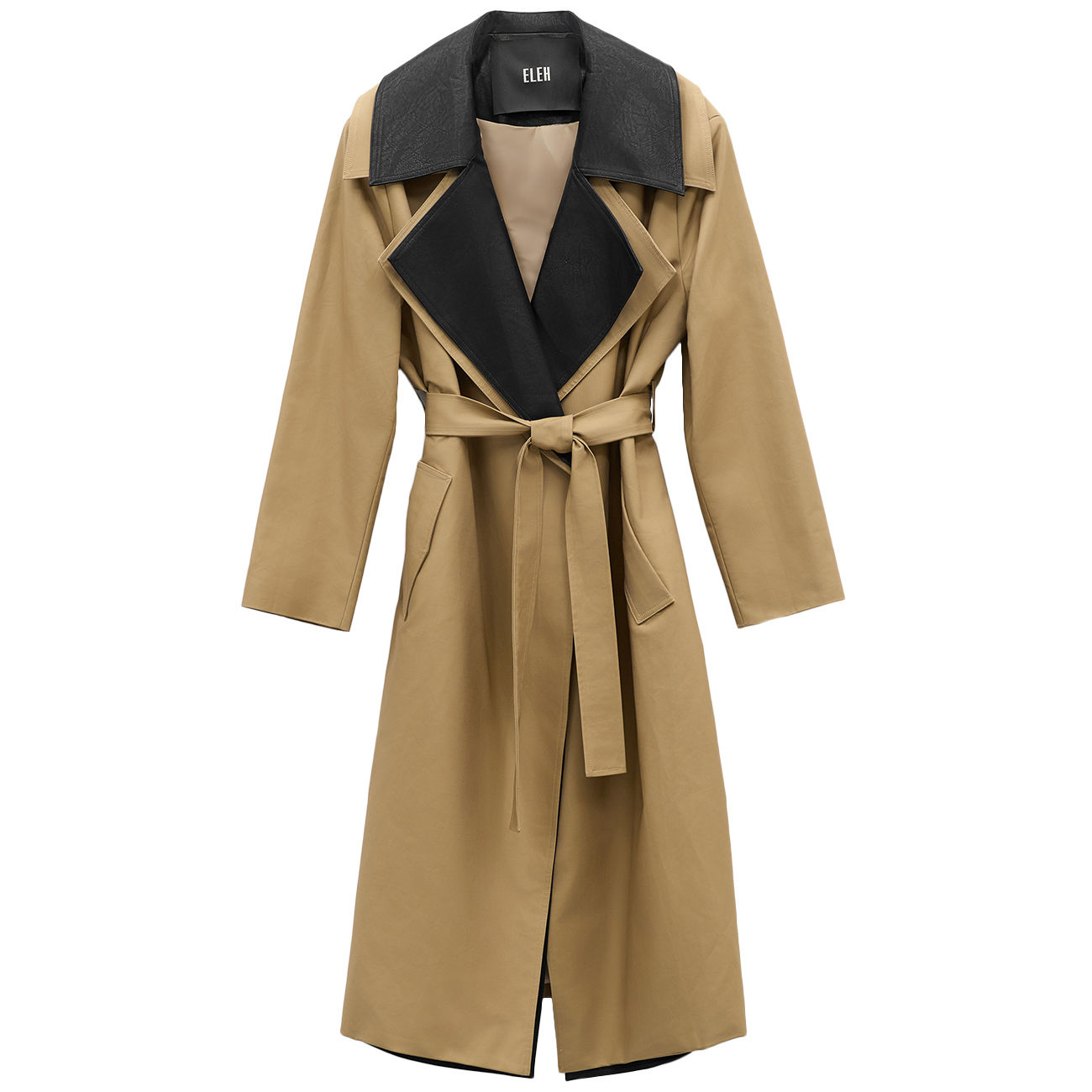 Il Trench Eleh con Profilo celebra la sartorialità contemporanea con un’eleganza intramontabile. La tonalità cammello, impreziosita dal collo a contrasto e dal profilo scuro, dona al capo un carattere deciso e sofisticato. La silhouette lunga e fluida, definita dalla cintura in vita, accompagna il movimento con grazia naturale. Ogni dettaglio riflette l’arte del taglio e della proporzione tipica di Eleh. Un classico reinterpretato, simbolo di lusso moderno e femminilità consapevole.
