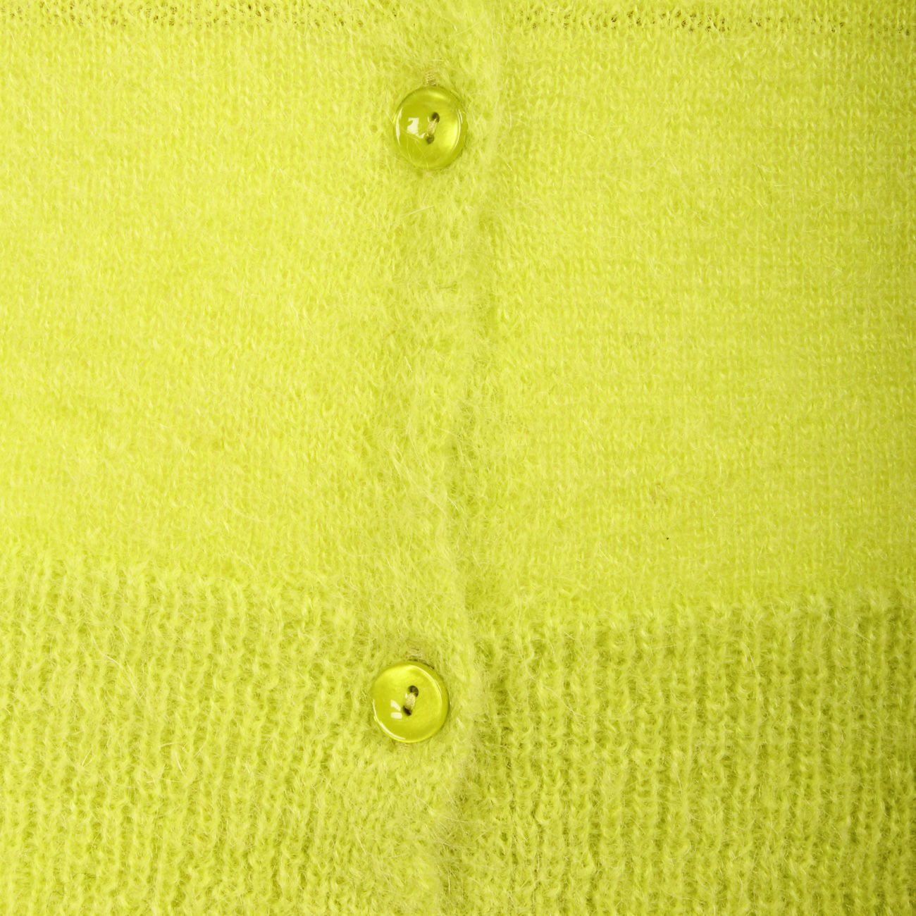 Cardigan donna in mohair e lana di alpaca, verde acido, scollo a V, orli a costine, chiusura frontale con bottoni in tinta, vestibilità regolare e slim sulla vita, ideale per un look femminile nella stagione autunnale ed invernale.
