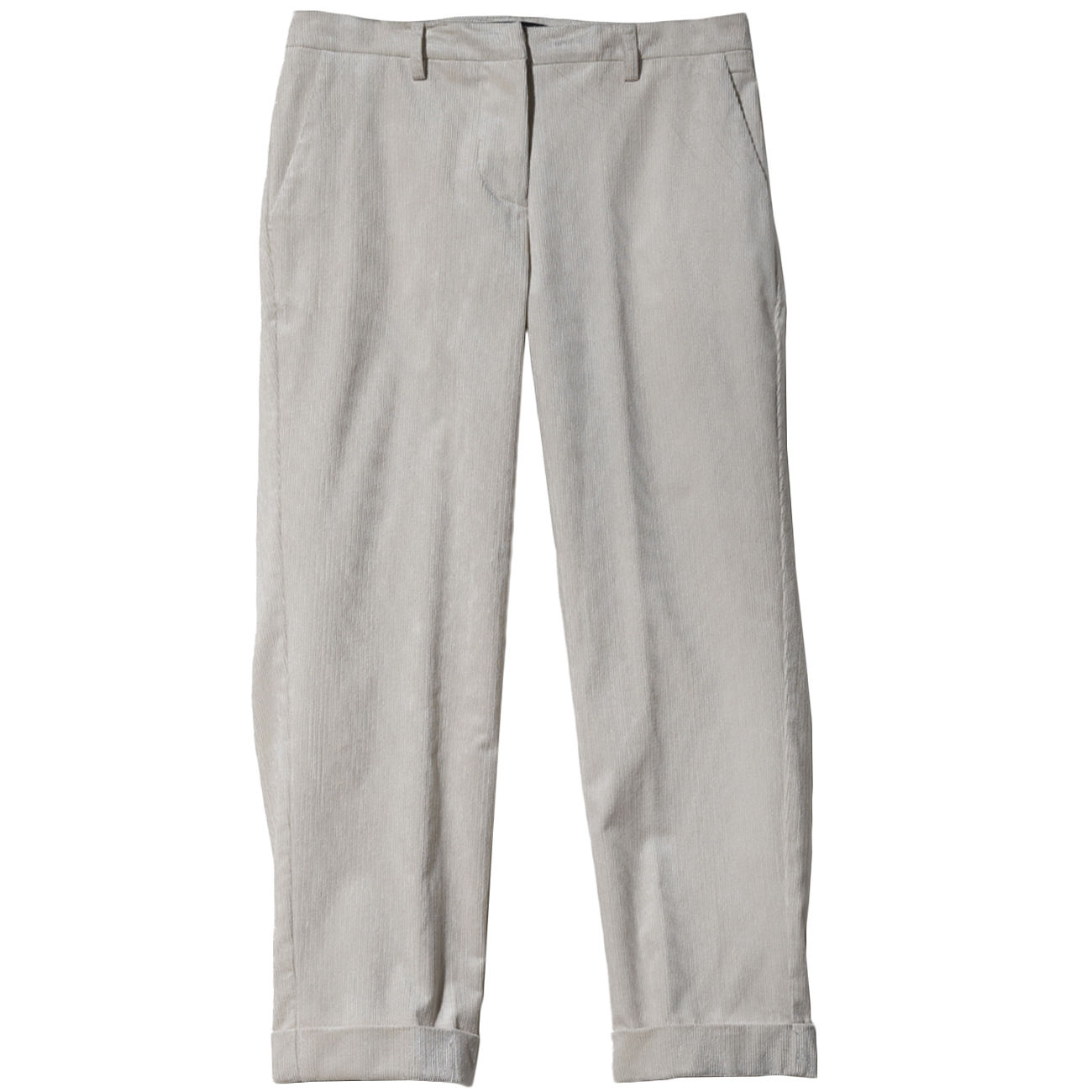 Questi pantaloni chino elevano il classico casual con un’eleganza discreta e contemporanea. Realizzati in velluto a costine sottili nella raffinata tonalità greige, un equilibrio perfetto tra grigio e beige, regalano una texture ricca e un comfort avvolgente. Il taglio dritto e leggermente cropped, impreziosito dal risvolto sartoriale, dona un’allure rilassata ma curata. La vestibilità bilancia armoniosamente praticità e stile, rendendoli ideali per l’ufficio o il tempo libero. Perfetti per creare look che combinano naturalezza, ricercatezza e mood sofisticato.