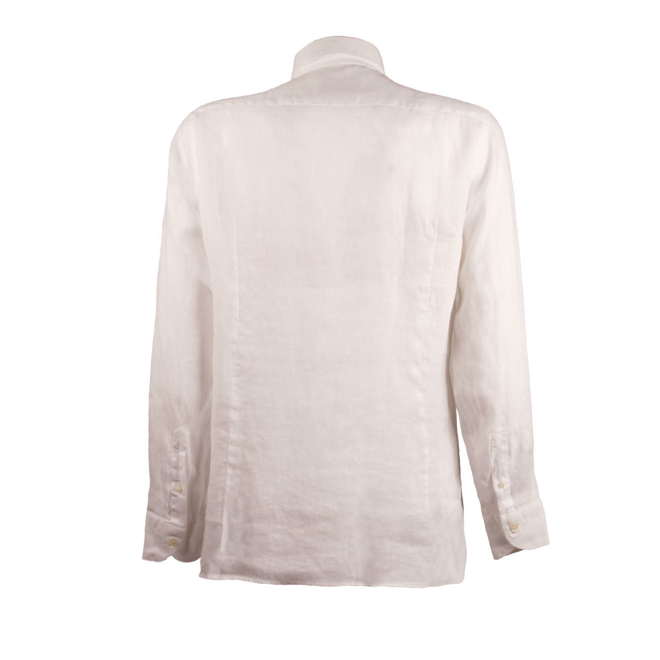 Camicia interamente realizzata in lino, con maniche lunghe, polsini abbottonati, colletto alla francese e chiusura con fila centrale di bottoni a vista tono su tono.