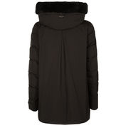 Giaccone lungo nero in piuma con cappuccio staccabile con pelo di volpe tono su tono. Collo alto, chiusura con bottoni a pressione edavantino removibile con chiusura a zip per un maggiore riparo dal freddo. Doppia tasca laterale con cernierina zip.