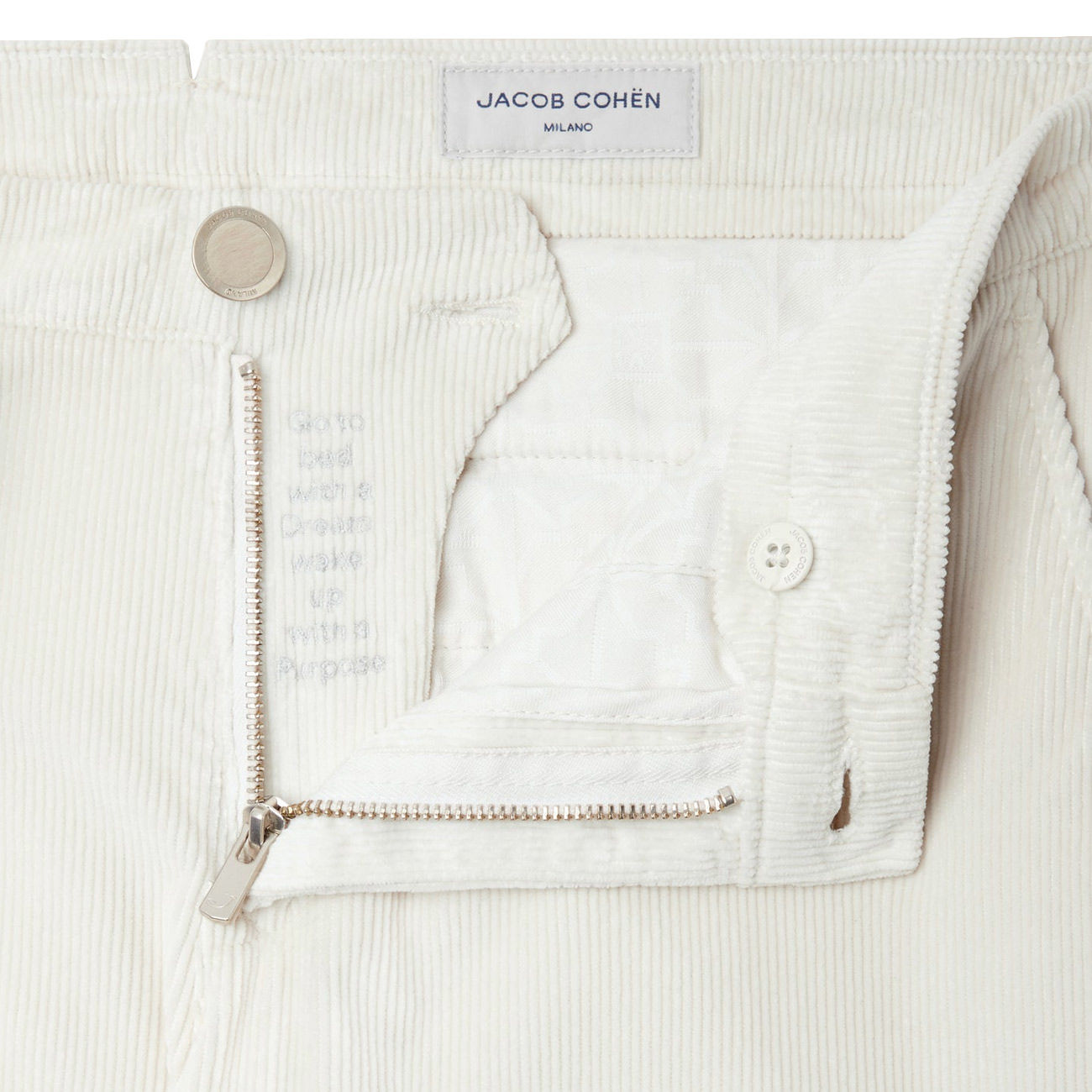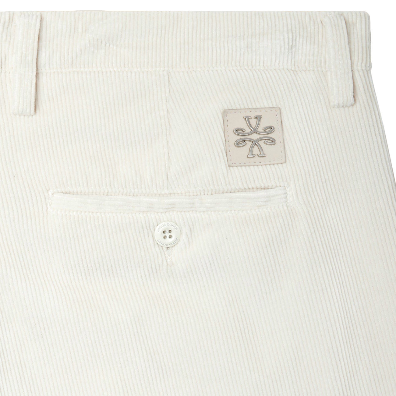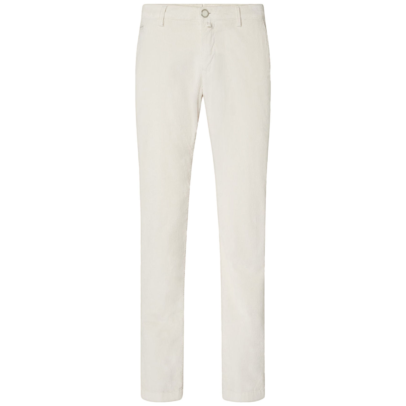I pantaloni Bobby chino slim fit a vita bassa di Jacob Cohen uniscono eleganza e comfort in una silhouette moderna. Realizzati in velluto a coste di cotone e modal stretch tinto in capo bianco, offrono morbidezza e vestibilità perfetta. La salpa in pelle scamosciata e il logo in metallo con finitura nickel aggiungono dettagli sofisticati. I bottoni a testa piatta con inserto in cavallino e la patta interna ricamata con nome del modello e citazione del fondatore ne completano l’esclusività. Un capo raffinato, ideale per chi cerca stile senza tempo con cura sartoriale.