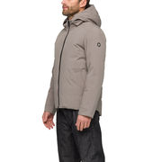 Giacca reversibile fullzip con cappuccio fisso. Lato nero in nylon liscio con tasche laterali con zip; lato blu in nylon trapuntato a quadri con tasche a filo. Mini logo in gomma sul petto, coulisse regolabile sul fondo.