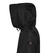 Parka con cappuccio con apertura con zip a doppio cursore, questo capo possiede due tasche scaldamani esterne chiuse con patta e bottone automatico, due grandi tasche basse esterne chiuse con patta e bottone automatico e tre tasche interne chiuse con zip. Sono presenti inoltre scomparti portapenne e asola per passaggio cuffie auricolari. Possiede inoltre una tasca alta nella schiena chiusa con zip. Dettaglio vita e fondo regolabili con coulisse elastiche.