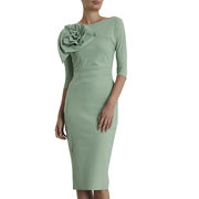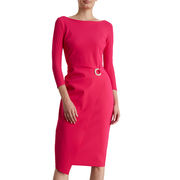 Questo abito blu scuro si caratterizza per una linea elegante e femminile, con scollo a V e maniche a tre quarti. I maxi bottoni oro personalizzati con il nome del brand aggiungono un tocco raffinato, mentre la doppia taschina laterale unisce praticità e stile. Completa il capo una mini zip invisibile sul retro, per una chiusura discreta e pulita. Perfetto per chi cerca eleganza e comfort.